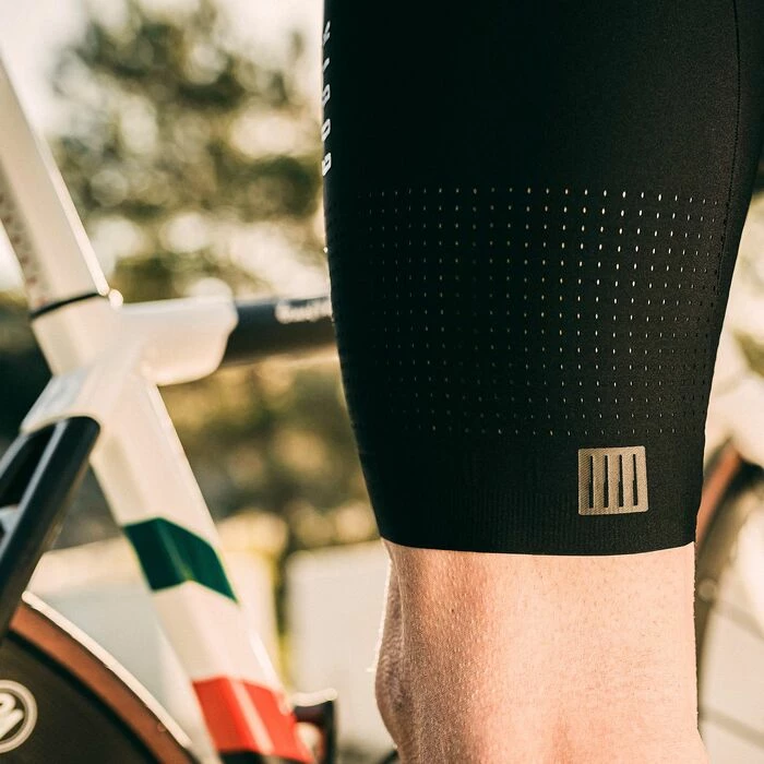 Nous avons choisi pour le corps du vêtement un tissu dense, perforé dans le bas et siliconé à l’extrémité, ce qui renforce l’opacité, la respirabilité et le maintien du au short cycliste.