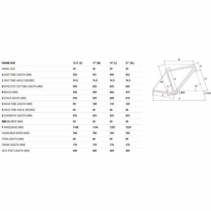 Tailles : 15.5″ (S), 17″ (M), 19″ (L), 21″ (XL)